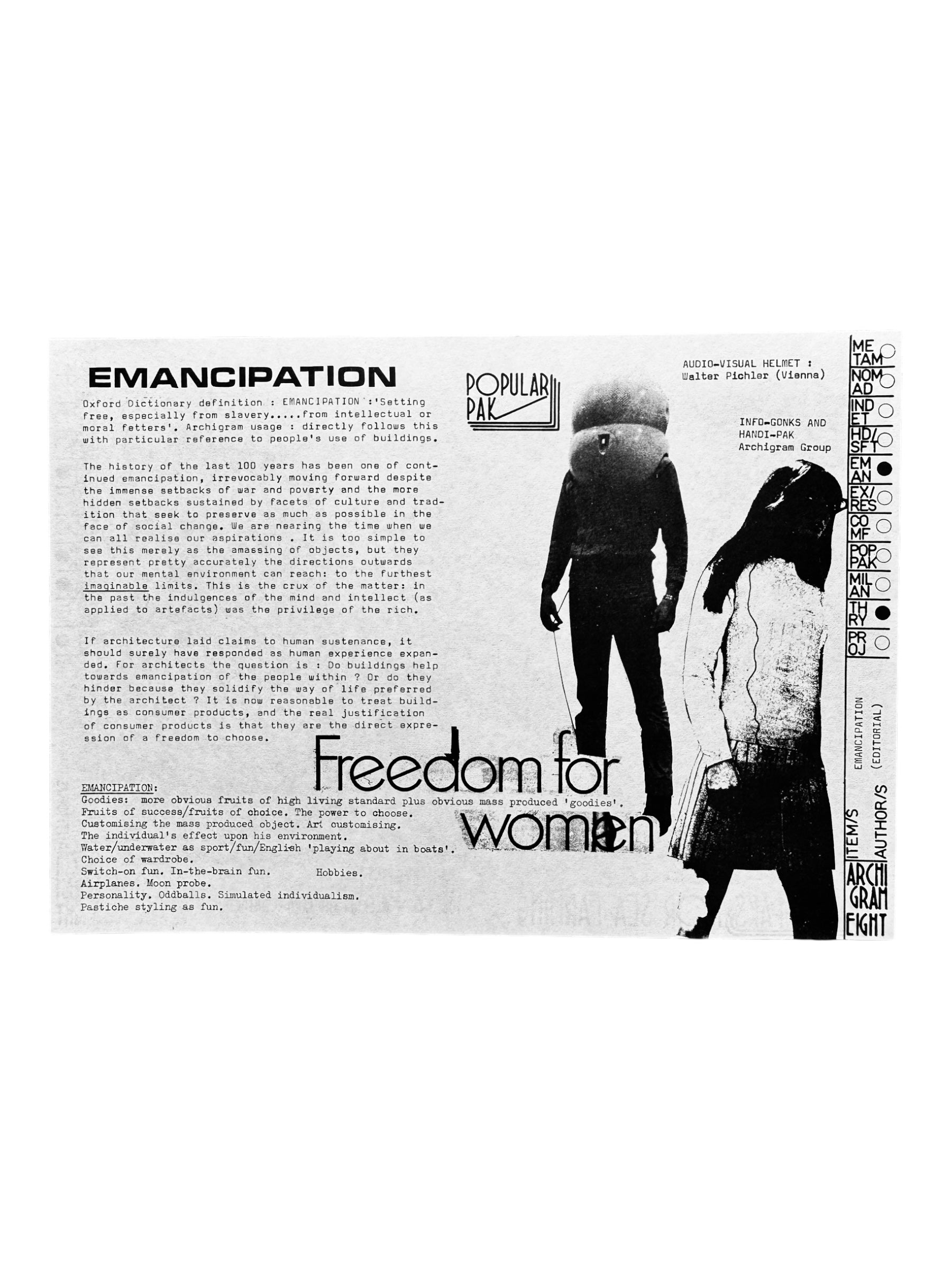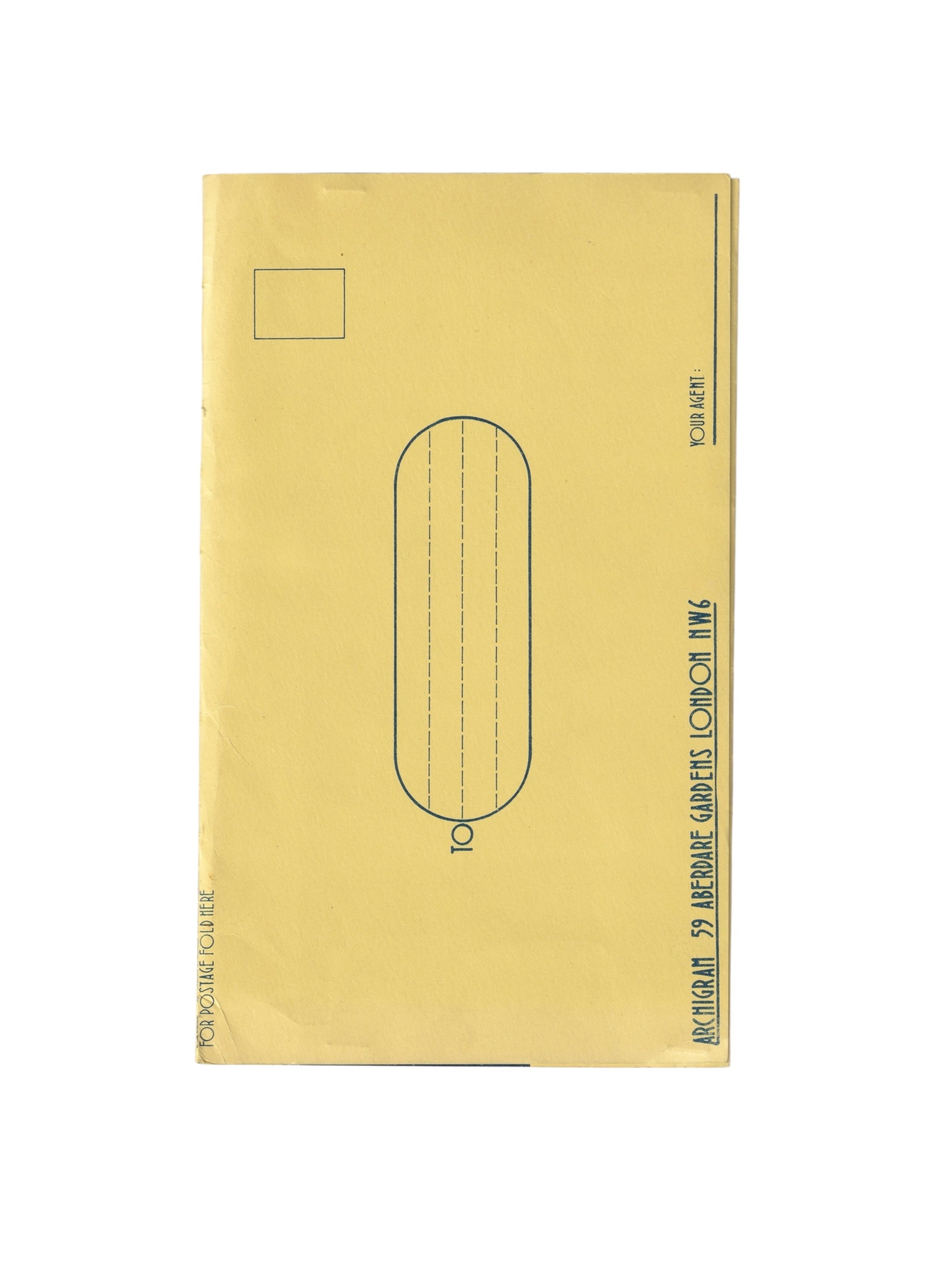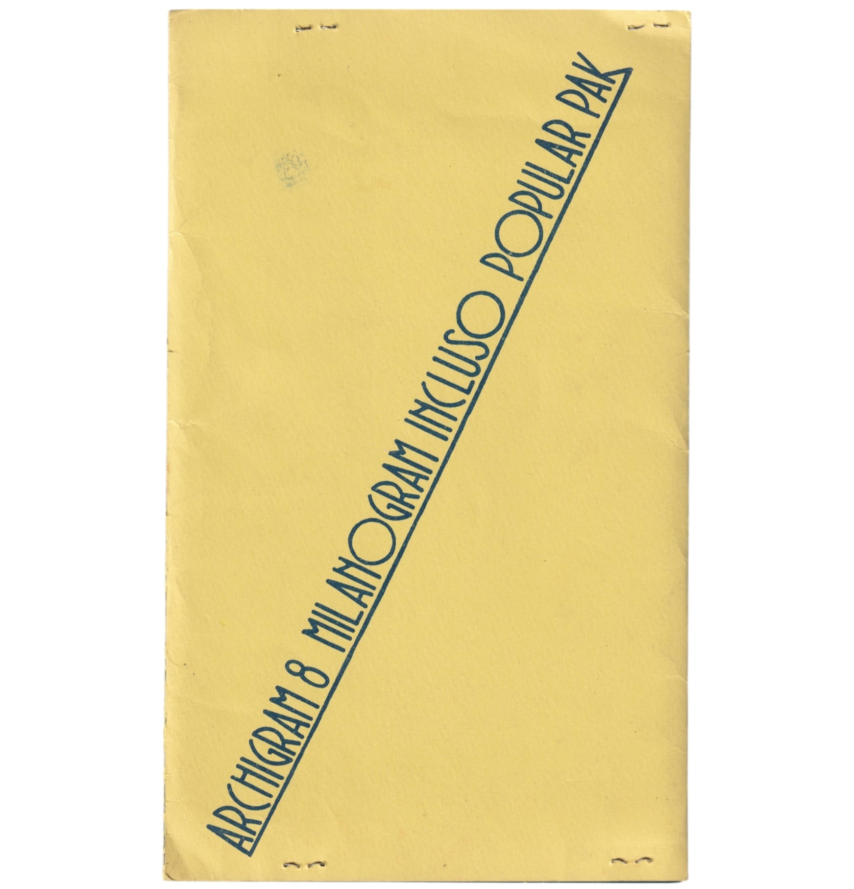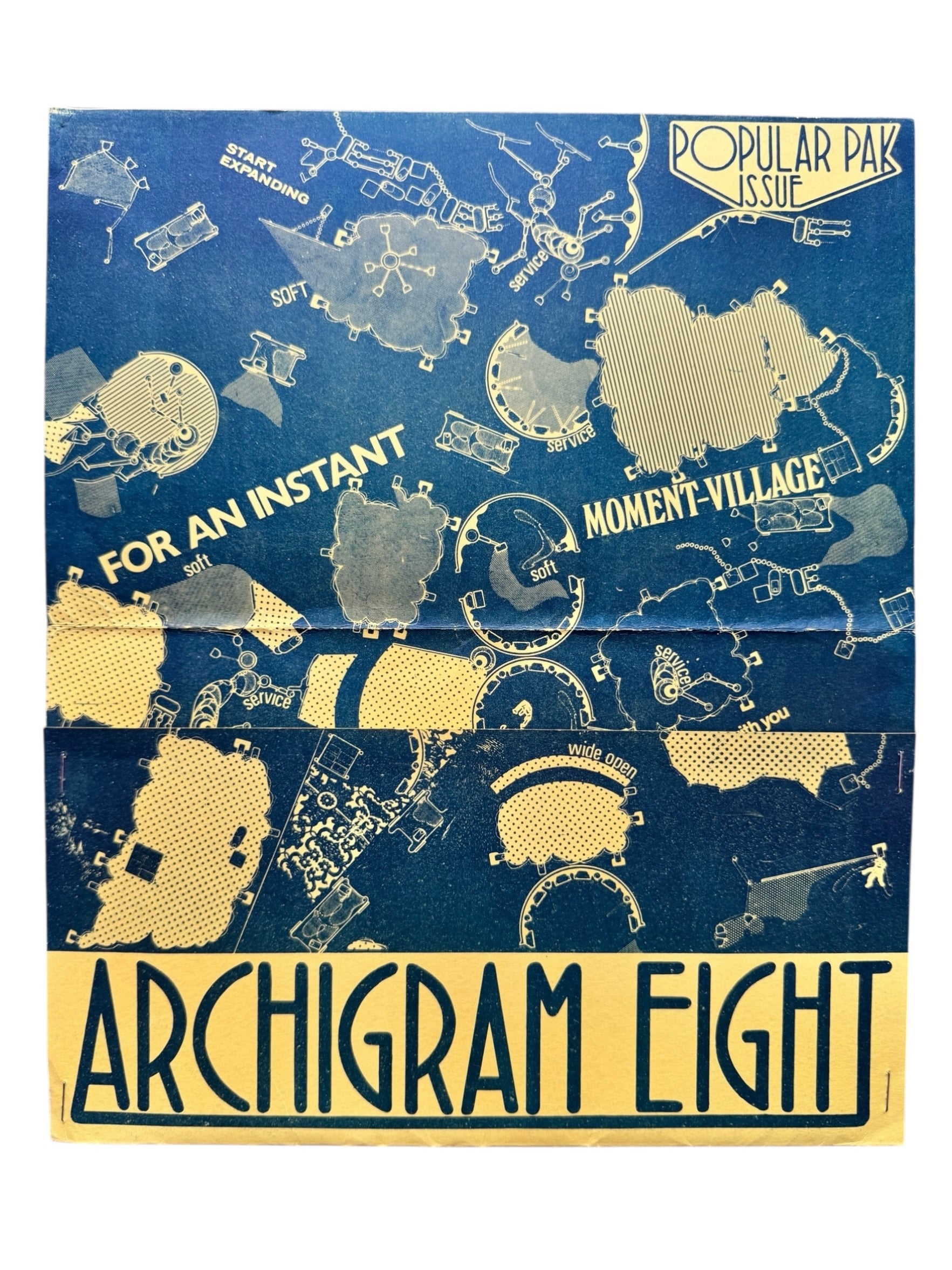 Archigram 8: Popular Pak, Archigram, London (1968), edited by Peter Cook, Softcover (yellow printed card folder with loose folded inserts), approx. 64 pages across 19 unnumbered sheets, 31.7 × 26.5 cm (open), 15.8 × 26.5 cm (closed), Very Good Condition, some light creasing to a few leaves.