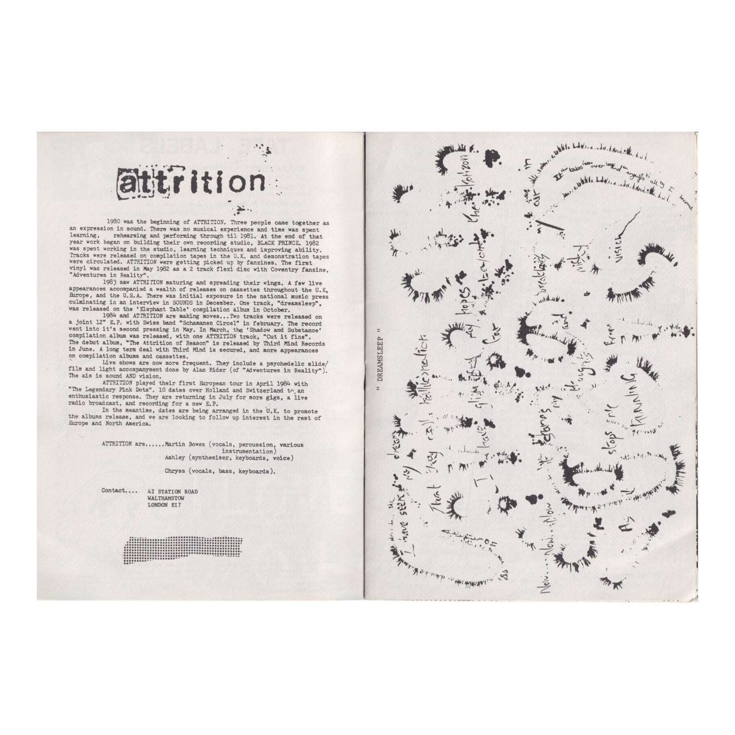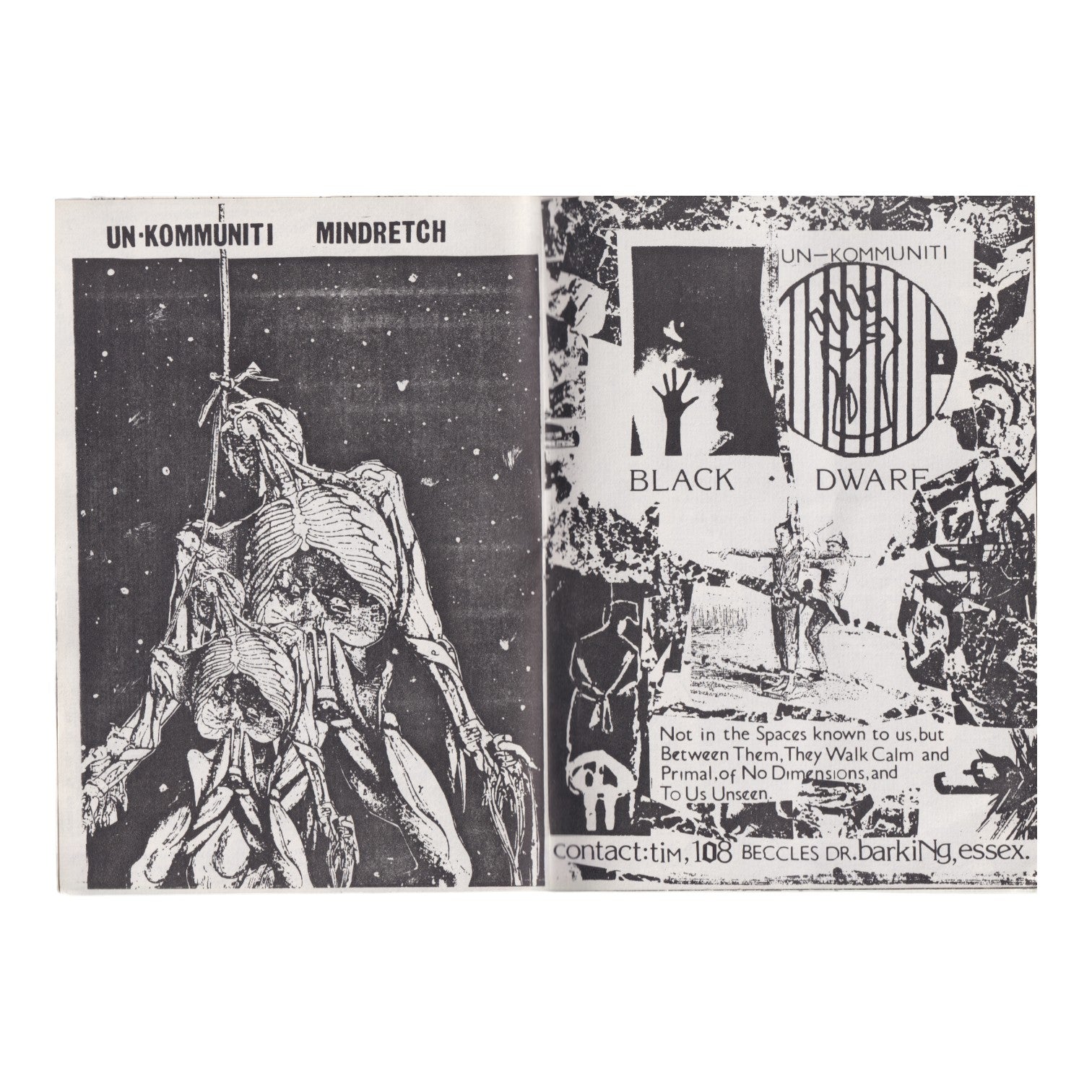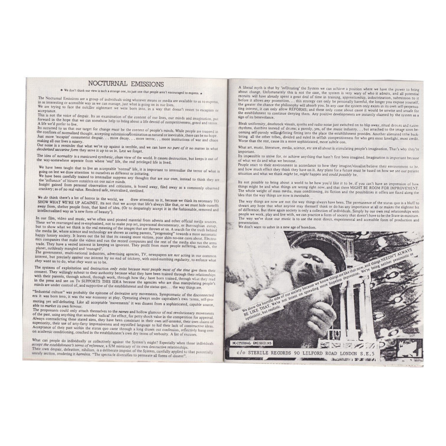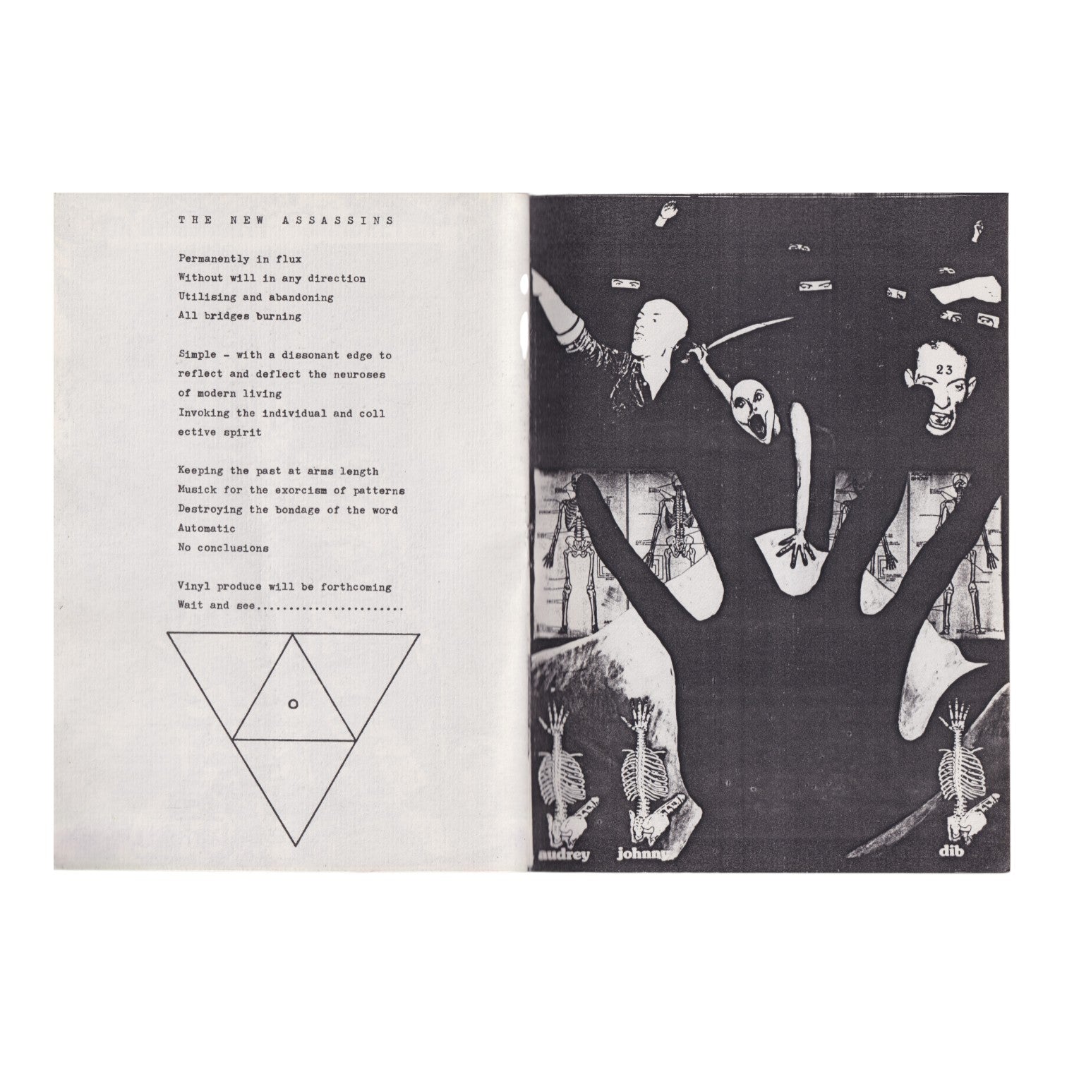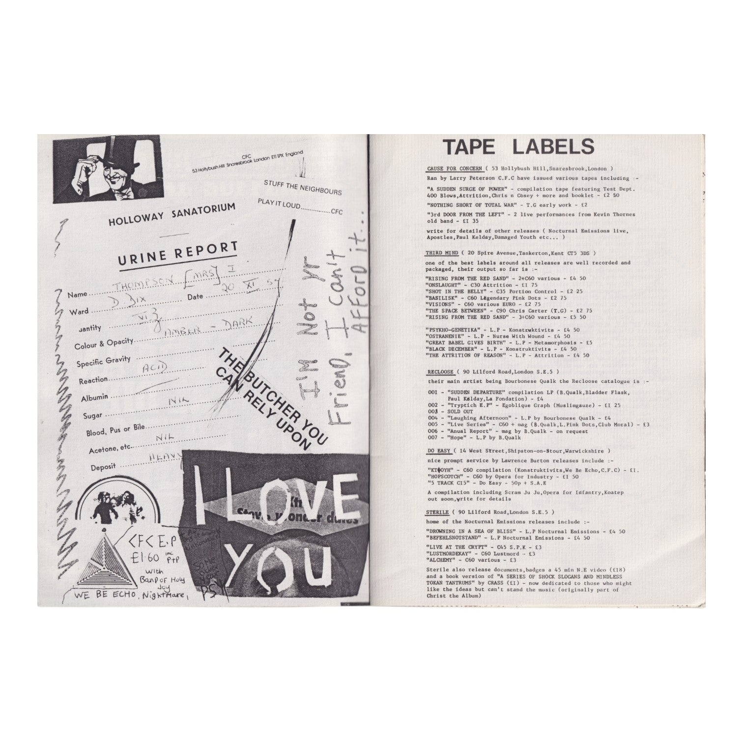 A scarce early 80s industrial zine featuring Nocturnal Emissions, Sema, The New Assassins, Un-Kommuniti, Attrition and others. Includes cassette label listings, manifestos, collage art, and mail-art style paste-ups.